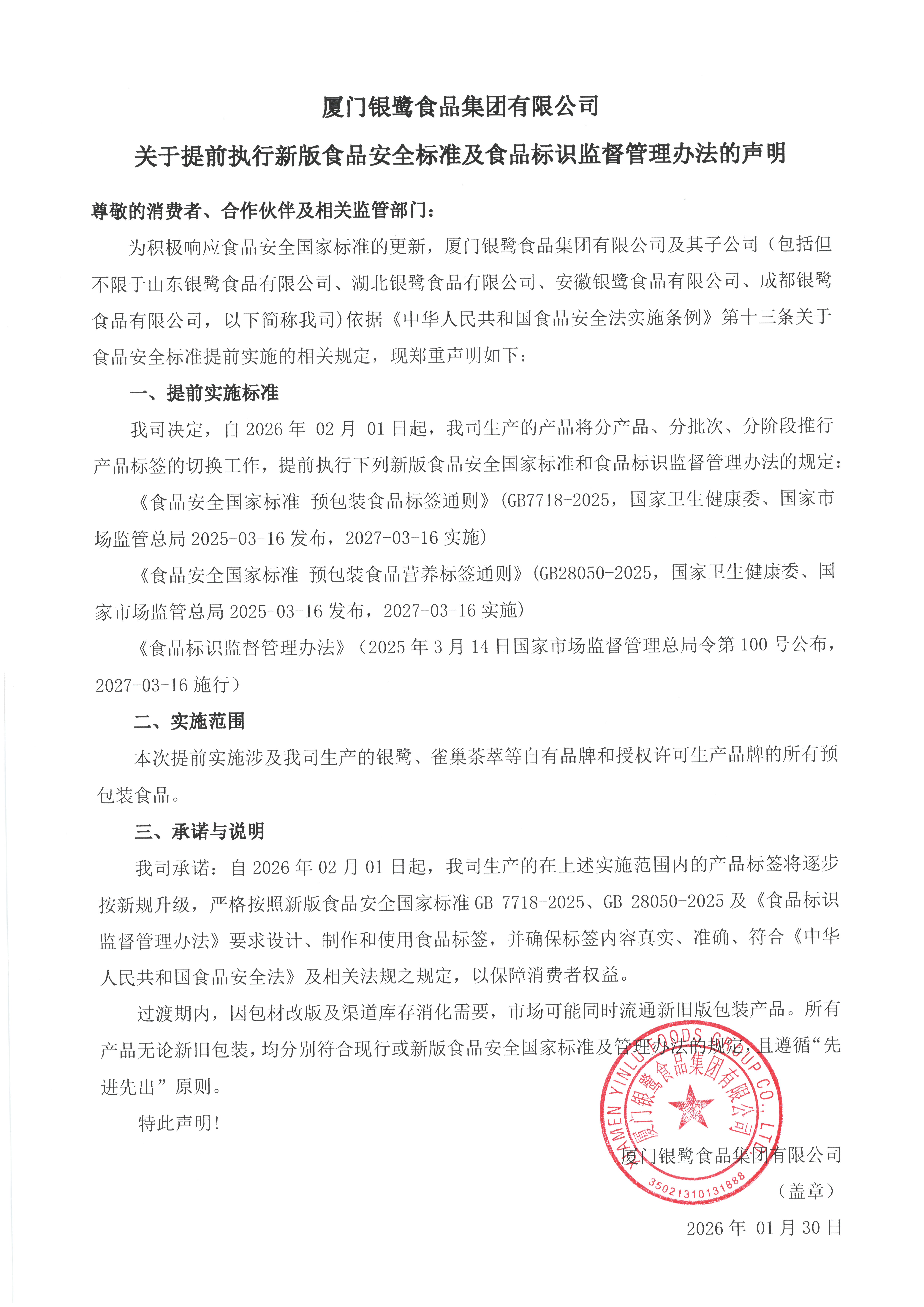厦门银鹭食品集团有限公司 关于提前执行新版食品安全标准及食品标识监督管理办法的声明